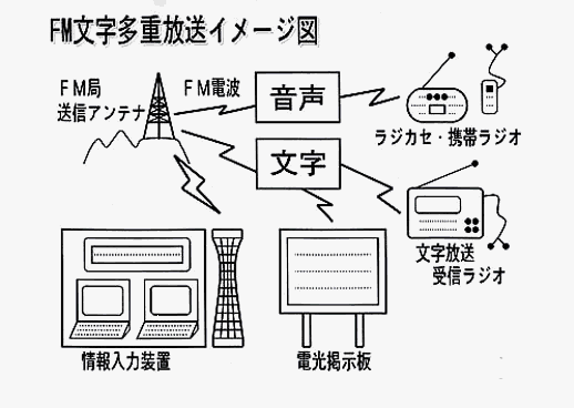 ●FM文字多重放送は、FM電波のすき間部分にデジタルデータ(文字や絵)を載せることをいいます。